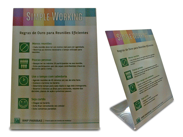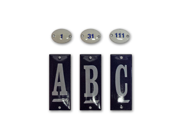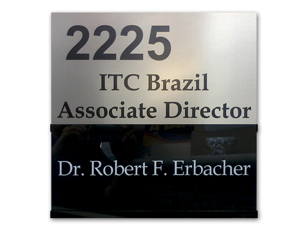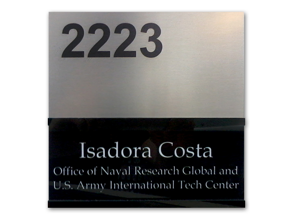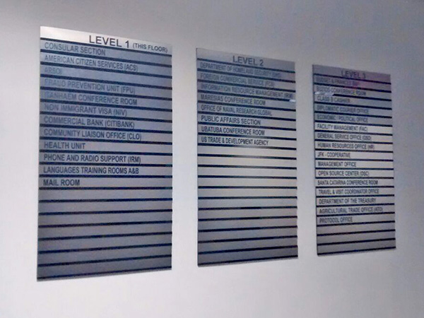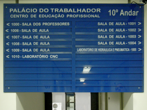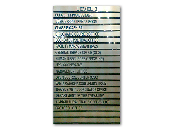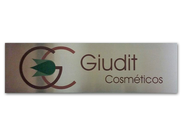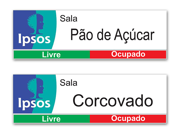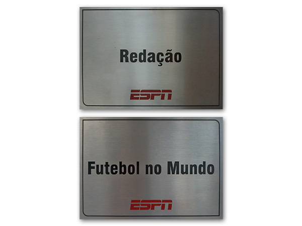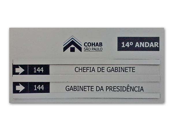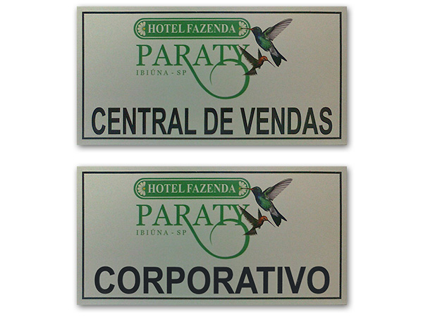 Placas personalizadas com logotipo para identificação de departamentos internos e externos.