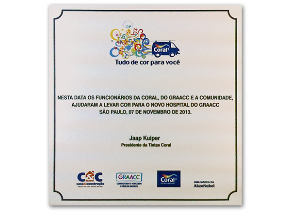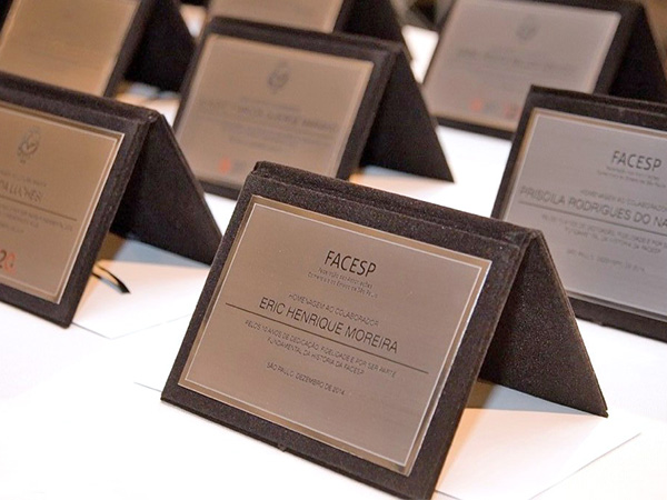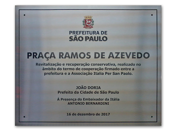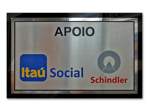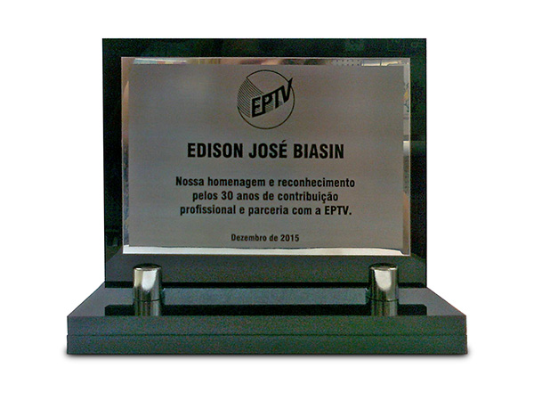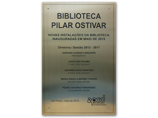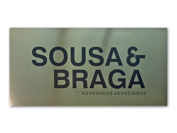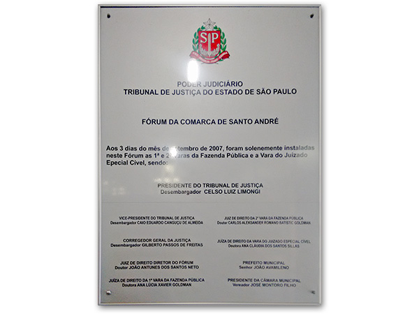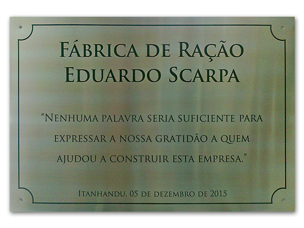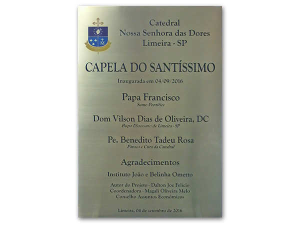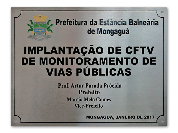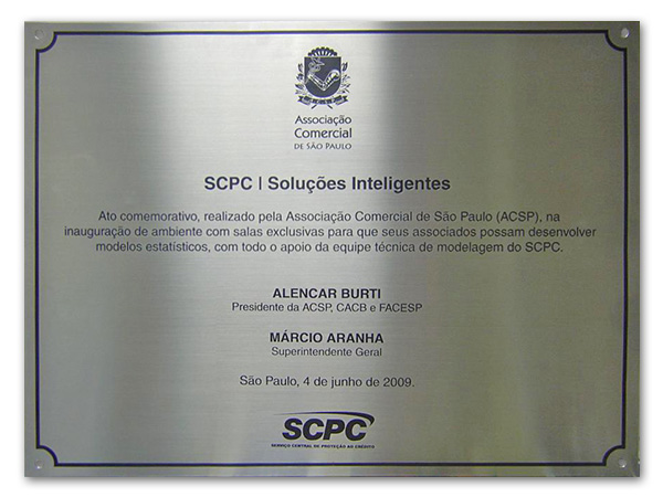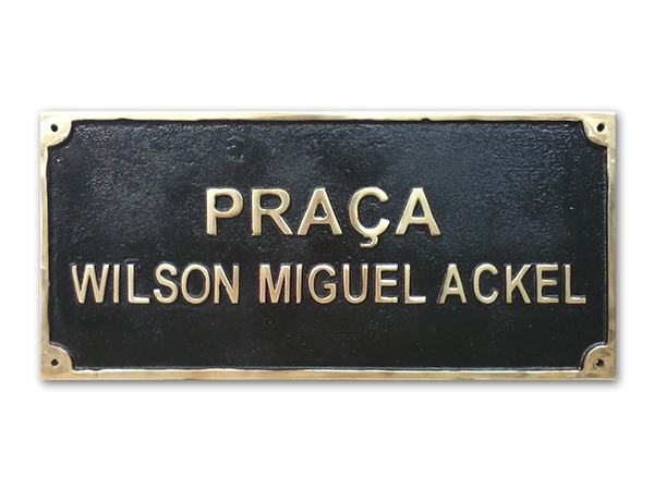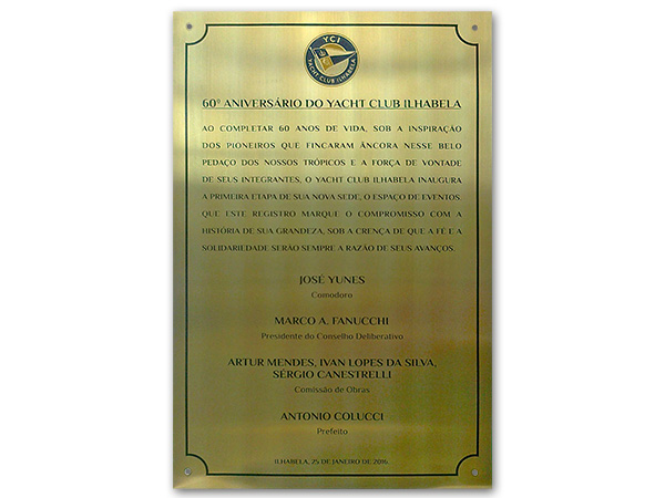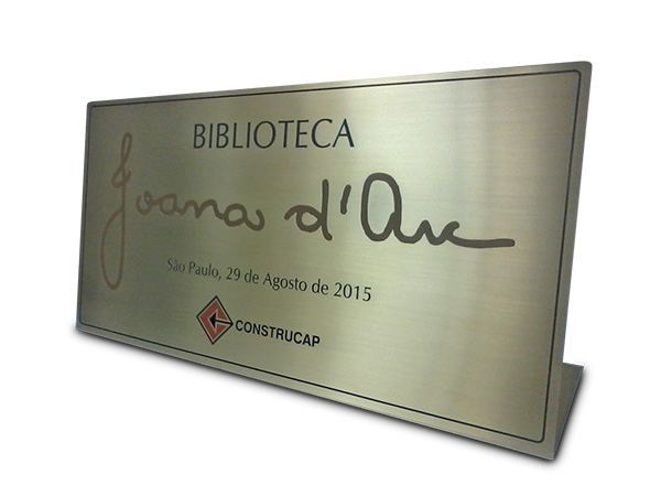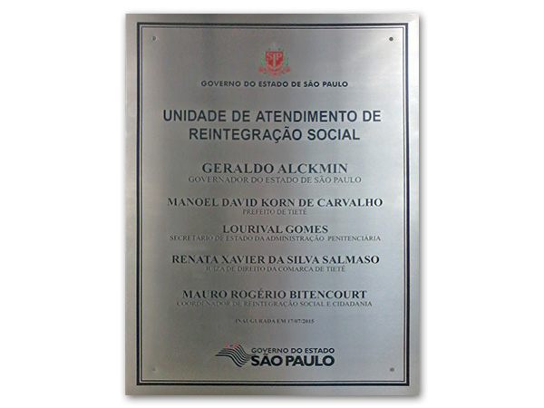 Placas gravadas em aço escovado e latão para inauguração de obras públicas e empresas privadas.